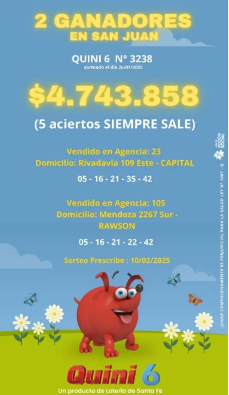 En el sorteo número 3238 del Quini 6, dos apostadores de San Juan resultaron ganadores de 4.743.858 millones de pesos cada uno, con apuestas realizadas en agencias de Capital y Rawson.
