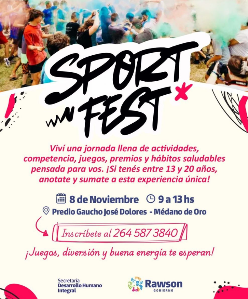 El próximo 8 de noviembre, el tradicional Predio Gaucho José Dolores, en Médano de Oro, se transformará en un gran estadio deportivo a cielo abierto para recibir la primera edición de la Sport Fest. Se trata de una propuesta innovadora impulsada por la Municipalidad de Rawson, destinada a chicos y jóvenes de 13 a 20 años, que busca combinar deporte, recreación y hábitos saludables en una jornada totalmente libre y gratuita.